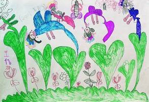 ....玉蕊仙子她“雪白花瓣金黄心,芳香扑鼻,亭亭玉立在万绿丛中,就像仙女一样。”这个儿童根据对花仙子的描述,将画面的二分之一空间画了巨大的花托,展现一片绿色。花仙子们从花托中腾空飞起,她们头戴金黄金黄的王冠,身穿各色的彩裙飞向西方。这幅画中,儿童根据我国古典淑女的装束对花仙的发型、首饰、头花等方面都做了具体联想,表现了理想的美女形象。