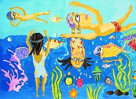 ....作者表现在水下游泳的情景就像在画面前边竖立着一块大玻璃,人们可以透过它看到水里游泳的人。水中不同深浅的蓝色和水草,说明他们是在深海中潜游,人们像鱼儿一样在水中自由漂浮。在大面积的蓝色中点缀着点点红色,使色调既对比又谐和。